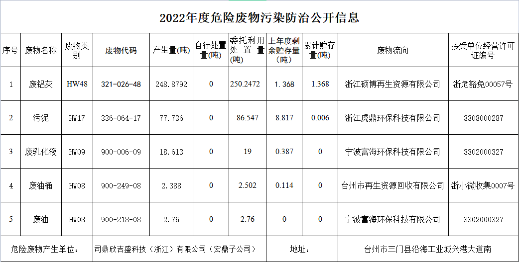2022年度危險廢物污染防治公開信息